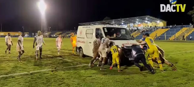 Ambulância socorre atacante, atola no gramado e é empurrada por jogadores em jogo do Sul-Mato-Grossense