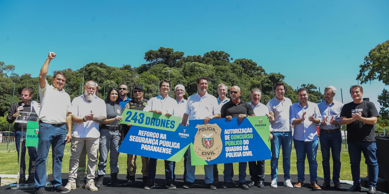 O prefeito Eduardo Pimentel acompanhou nesta sexta-feira (6/2), no Parque Barigui, a entrega de 243 drones e acessórios realizada pelo governador Carlos Massa Ratinho Junior às forças de segurança das polícias Militar, Civil, Penal, Científica e do Corpo de Bombeiros nos municípios. O prefeito destacou a importância dos investimentos e anunciou que a Guarda Municipal de Curitiba (GMC) ganhará um grupamento aéreo com futura compra de drones para reforçar o combate ao crime na capital.